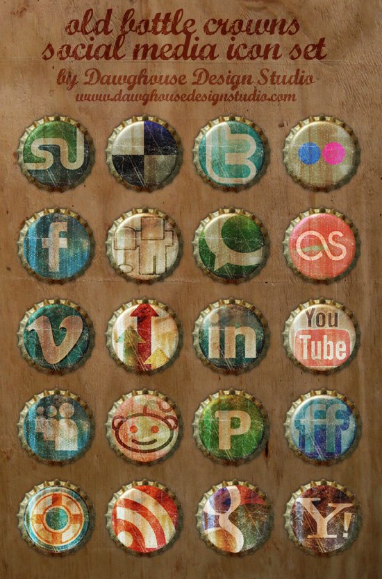 Free Social Media Icons: Old Bottle Crowns Icon Set is particularly for those who want to add innovativeness to charm. As the name itself suggests, the designer has used bottle crowns as the theme.
